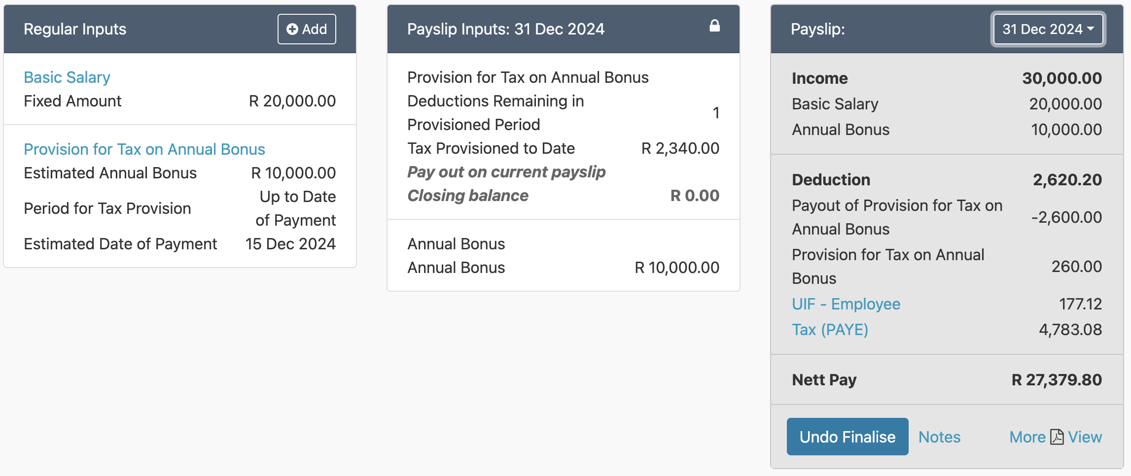 If you hadn’t yet added an annual bonus to the December payslip, you will be reminded to do that, too. When you now finalise the December payslip (after having paid out the provisioned tax and added the bonus), you will see that December’s Nett Pay is exactly R10 000 more than the Nett Pay of November (and the preceding months).
