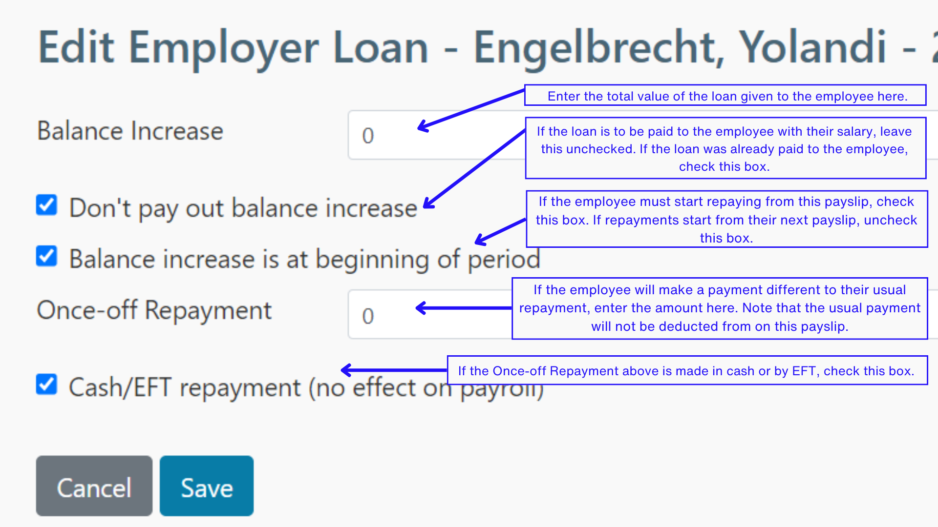 Entering a Once-off Repayment will override any regular repayment defined for this loan – on the current payslip only. You can also tick the Cash/EFT repayment (no effect on payroll) box if the repayment was made off payroll and is being recorded on SimplePay to decrease the loan balance.